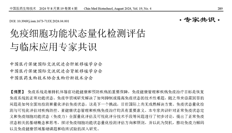 《中國(guó)醫(yī)藥生物技術(shù)》正式發(fā)布了《免疫細(xì)胞功能狀態(tài)量化檢測(cè)評(píng)估與臨床應(yīng)用專(zhuān)家共識(shí)》。這份共識(shí)是中國(guó)醫(yī)療保健國(guó)際交流促進(jìn)會(huì)肝臟移植學(xué)分會(huì)、中國(guó)醫(yī)療保健國(guó)際交流促進(jìn)會(huì)腎臟移植學(xué)分會(huì)以及中國(guó)醫(yī)藥生物技術(shù)協(xié)會(huì)生物診斷技術(shù)分會(huì)等多個(gè)權(quán)威機(jī)構(gòu)共同推出的關(guān)于免疫狀態(tài)量化檢測(cè)和可視化評(píng)估以及與臨床應(yīng)用場(chǎng)景的專(zhuān)家共識(shí)。