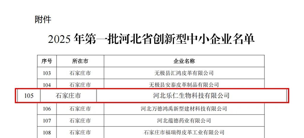 近日,河北省工業(yè)和信息化廳發(fā)文公布,2025年第一批河北省創(chuàng)新型中小企業(yè)名單,河北樂仁生物科技有限公司榜上有名!